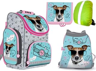 4-teiliges Schulranzenset My Little Friend Ranzen Schulranzen mit Federtasche, Turnbeutel und Regenschutz für Kinder Hund Dog
