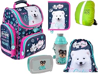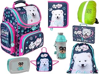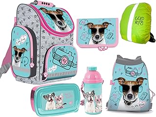 My Little Friend 8-teiliges Schulranzen Set ergonomischer Ranzen Federmappe Turnbeutel Brotdose Trinkflasche Dokumappe Malschürze Regenschutz Kinder Hund Dog